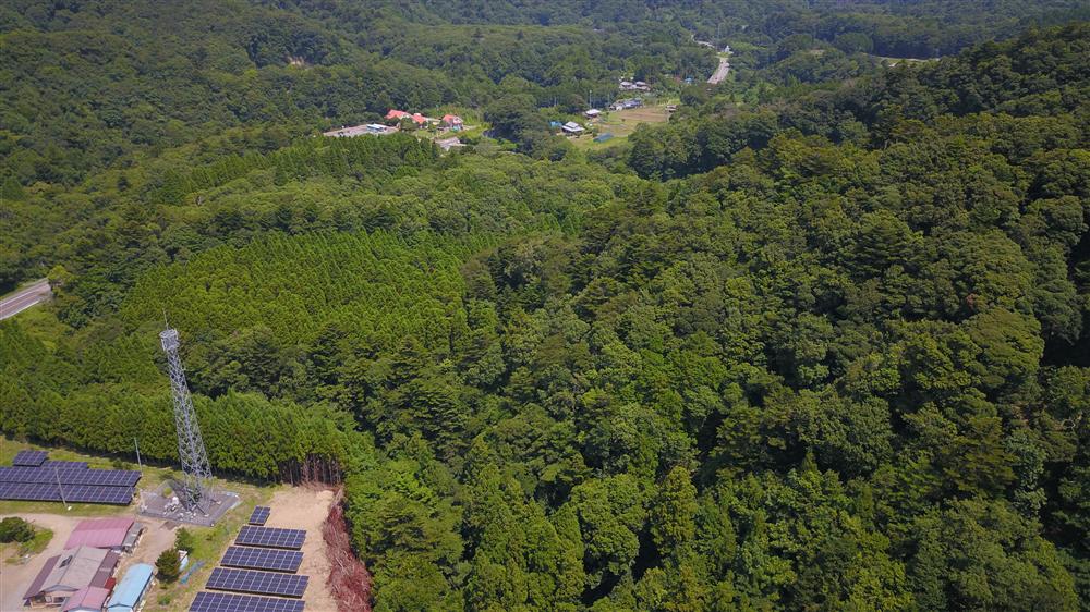 写真上野赤い屋根の家が清水渓流広場駐車場、鉄塔とソーラーパネル傍が亀岩の洞窟の上流