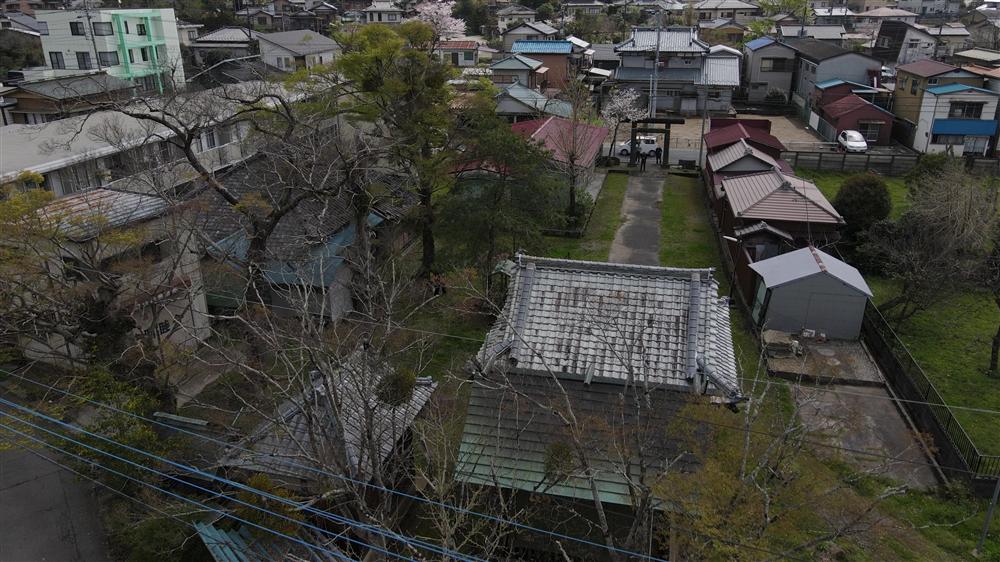 君津市 2021 神明社 (久留里 久留里市場) 空撮 (写真) 社殿裏手上空から境内と周辺