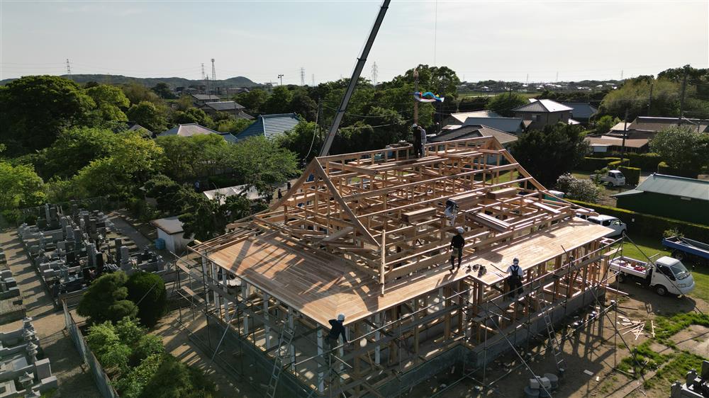 君津市 2024 富西寺 本堂新築 仏式 上棟式 空撮 本堂 全景 東北上空より